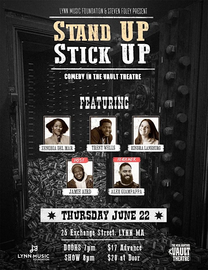 Presented by the Lynn Music Foundation Stand Up Stick Up is a monthly stand up comedy show featuring felonious-sly funny young comics from across New England and beyond, held in the heart of a former historic bank. Presented by the Lynn Music Foundation in partnership with Steven Foley Media Productions